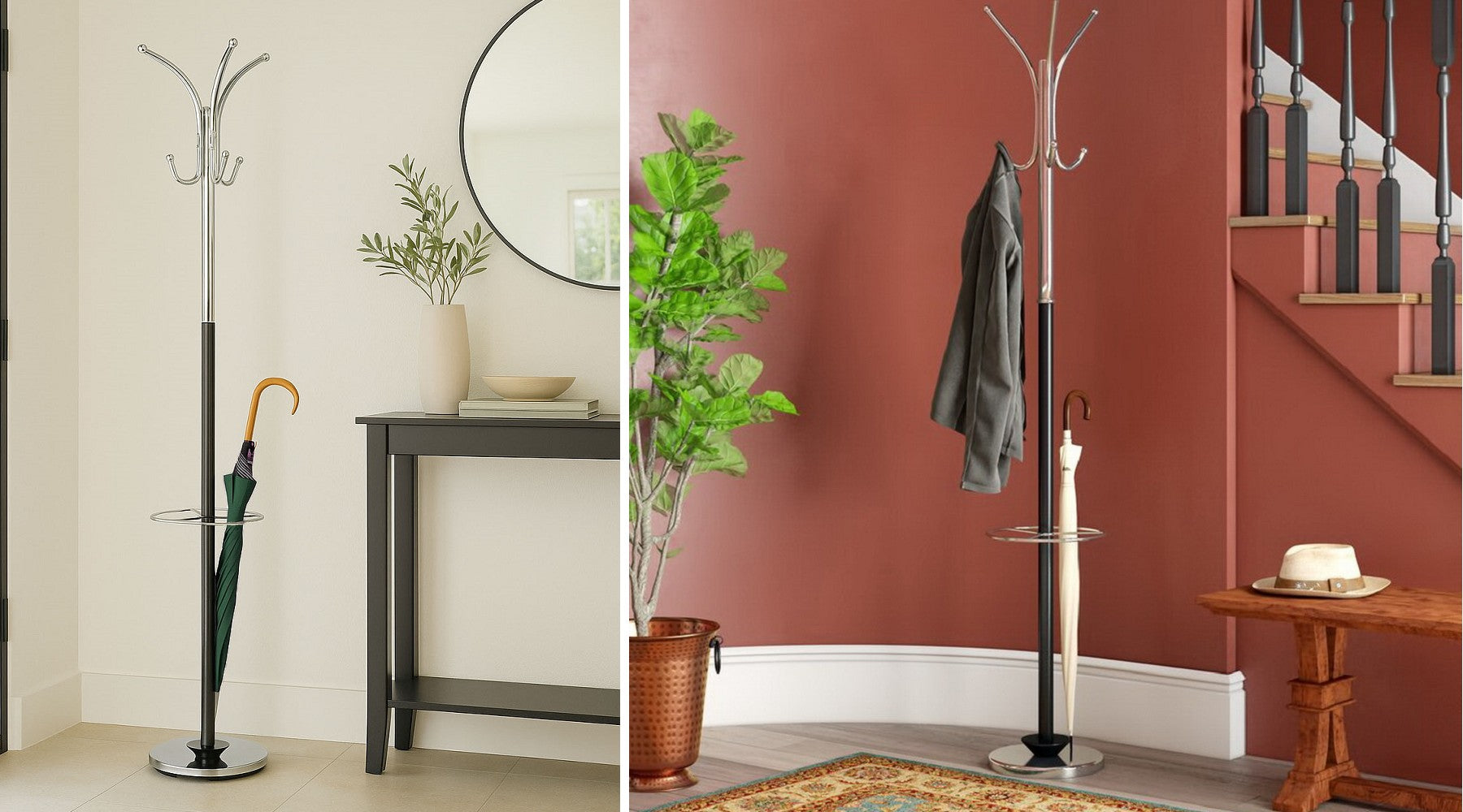 This sleek practical Coat Stand comes complete with 6 coat and hat hooks with Chrome plated tips, also with an umbrella stand, easily store your Coats, Hats, Bags and Umbrellas.