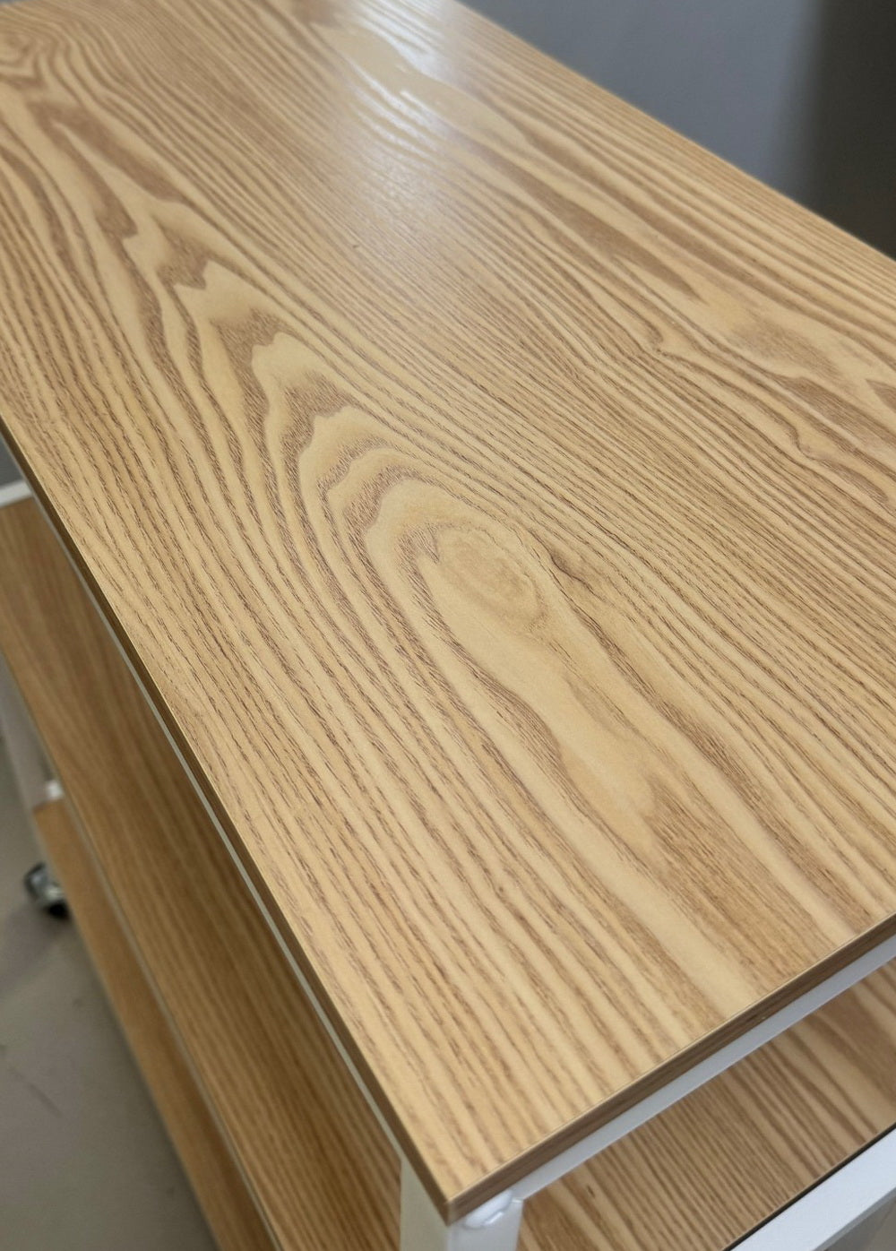 • Functional and stylish cart with three open tiers and mobile caster wheels for easy movement and quick access. Contemporary shelving trolley combining wood-finish surfaces and a metal structure—great for serving, storing, or displaying items.