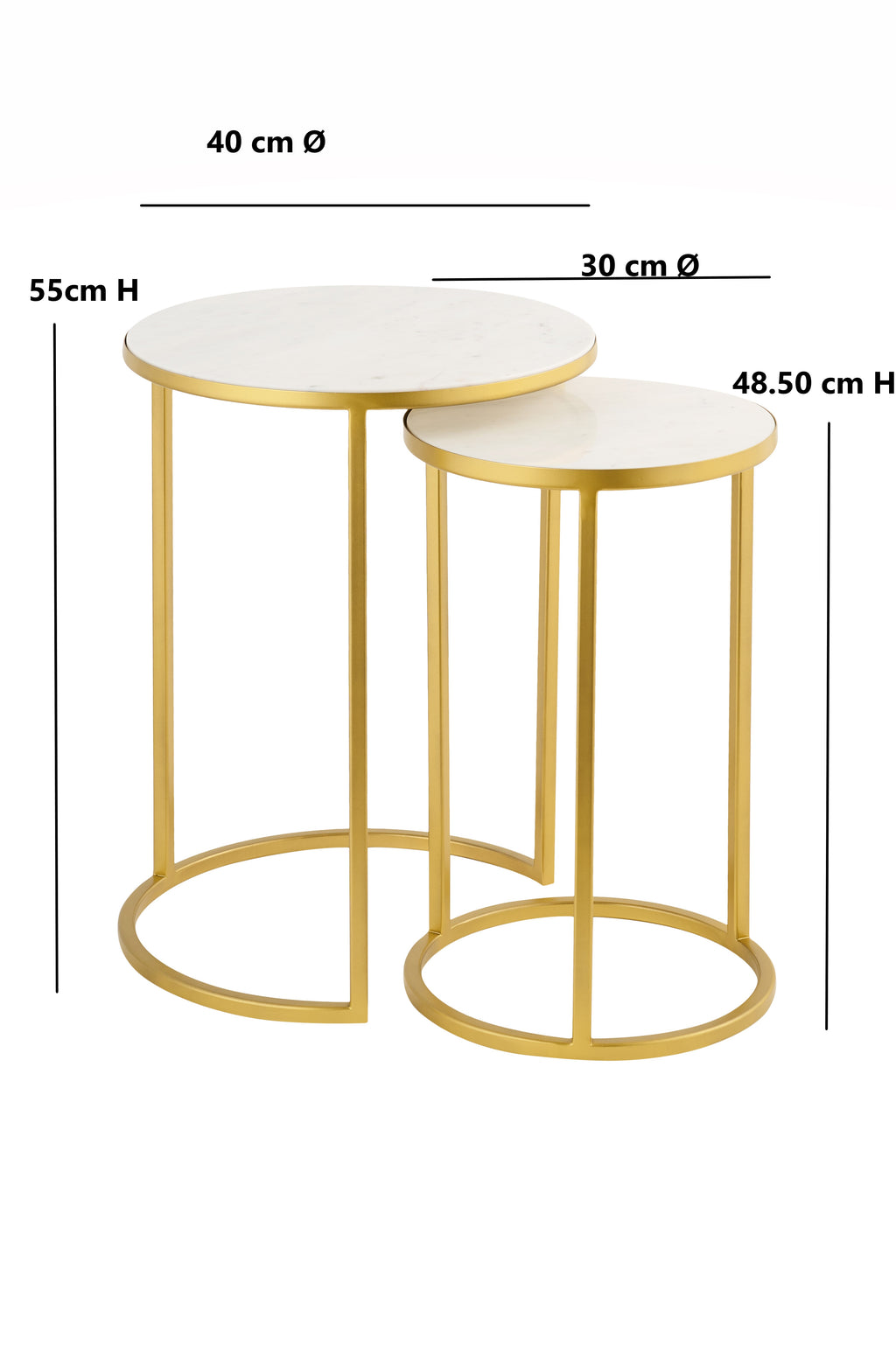 - Elevate your living space with this chic set of 2 nesting tables, featuring a sleek combination of white marble tops and elegant gold-finished metal frames. Designed for both style and practicality, these tables can be used together for a layered look or separately as side tables, coffee tables, or nightstands.