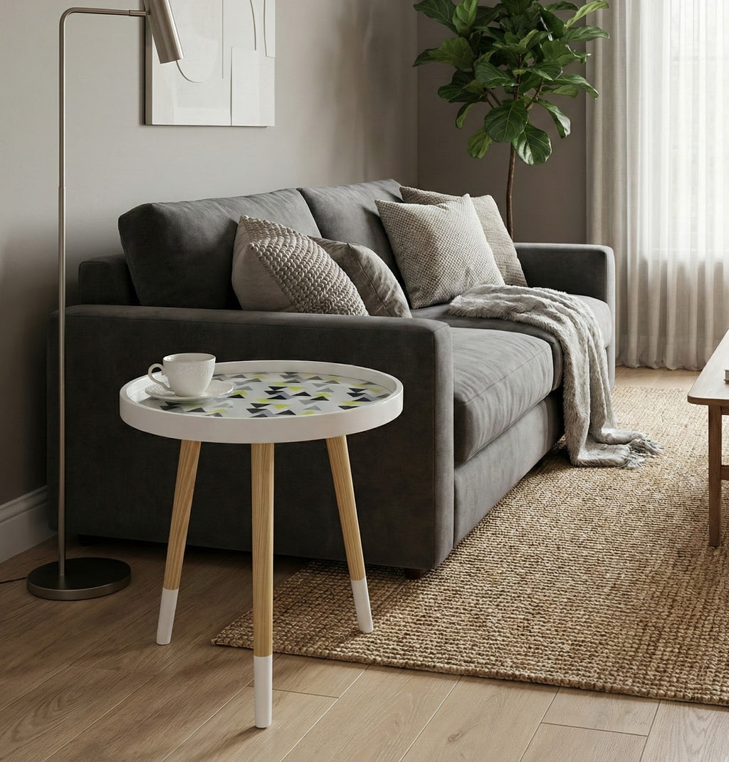 Leonie Side Table -White Top With Multi-Coloured Triangle Pattern & Natural Legs