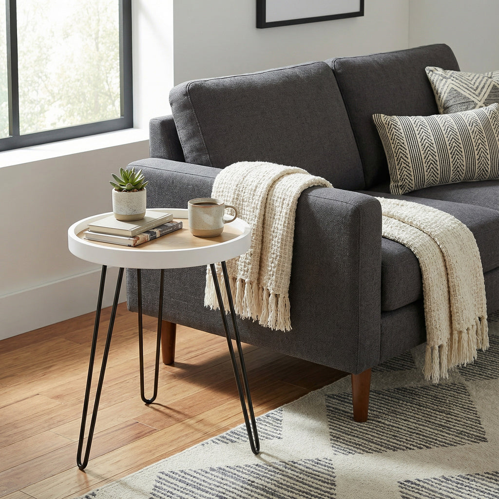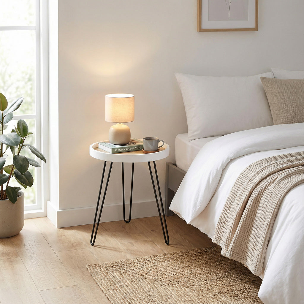 • Features round top with a lipped edge, finish with white and ash veneer, and three hairpin legs our decorative side table will add confident style to your space.
