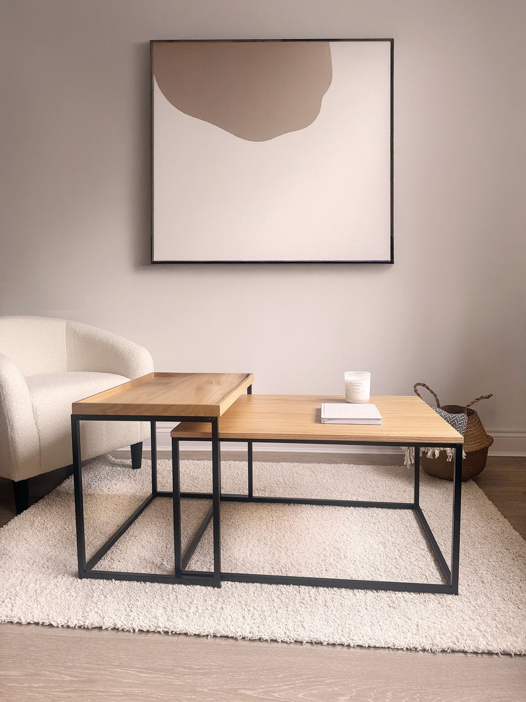 • The Novani Mixed Material Nesting Coffee Table Set makes a dynamic pair. Scatter the set around a room, or tuck the large Table under the accent table for a mid-century modern layered look.