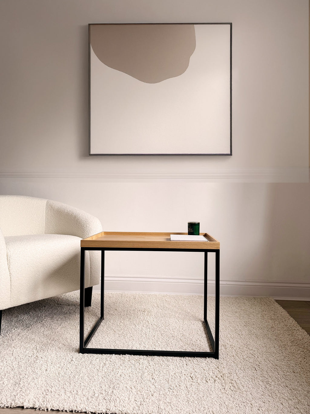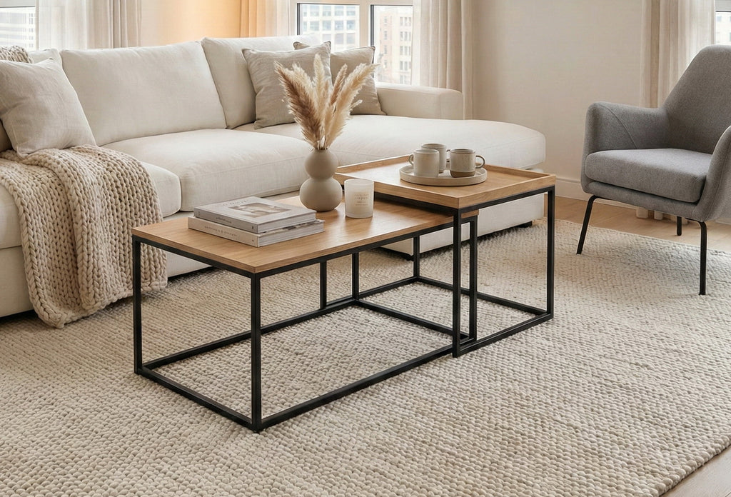 • Novani Mixed Material Nesting Coffee Table Set allows for easy storage when they're grouped together or they function as two separate tables when you display them apart. This set includes a Coffee table and an End table, all durably constructed of engineered wood. The boxed frames are with Black finish. Each tabletop is made of MDF and finished with Oak Veneer. The end table also has a raised border that will keep decorative items contained.